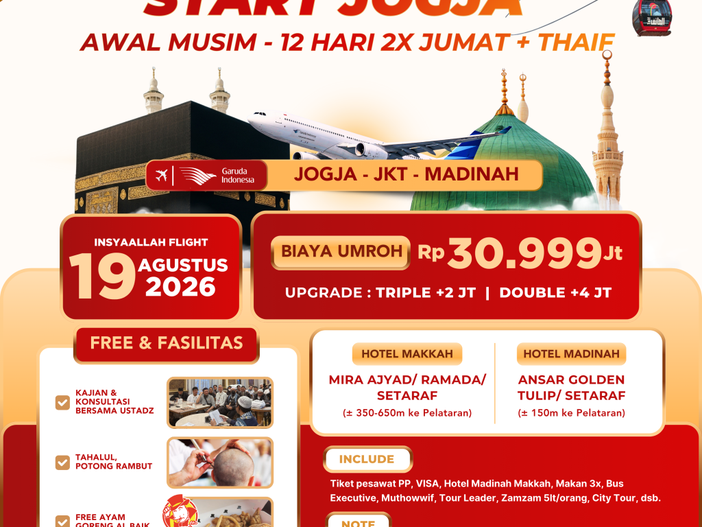19 Agustus 2026 (GA) ~ 12 Hari ~ Umroh Silver Start Jogja 2x Jumat + Thaif