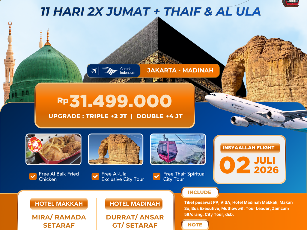 02 Juli 2026 (GA) ~ 11 Hari ~ Umroh Silver 2x Jumat + Thaif + Al Ula + Free Kereta Cepat
