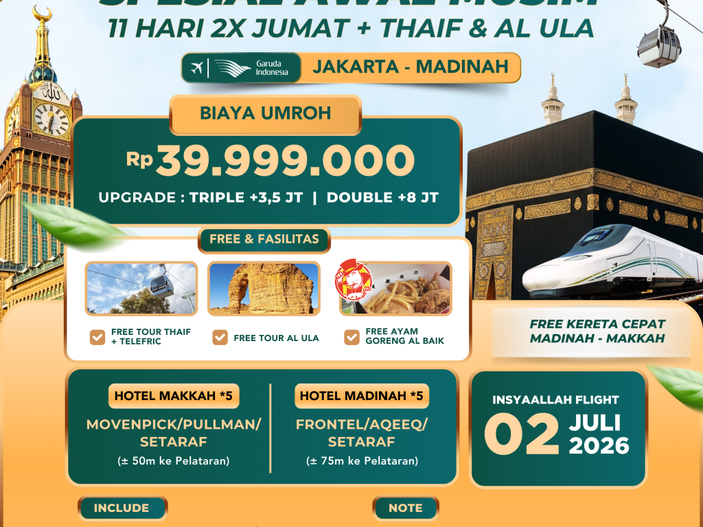 02 Juli 2026 (GA) ~ 11 hari ~ Umroh Platinum *5 2x Jumat + Thaif + Free Telefric + Al Ula + Free Kereta Cepat