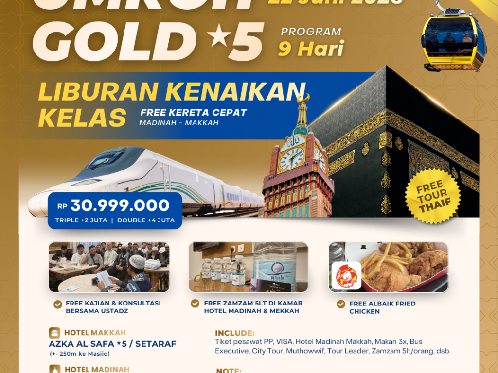 22 Juni 2026 (SV) ~ 9 Hari ~ Umroh Gold *5 Plus Thaif + Free Kereta Cepat